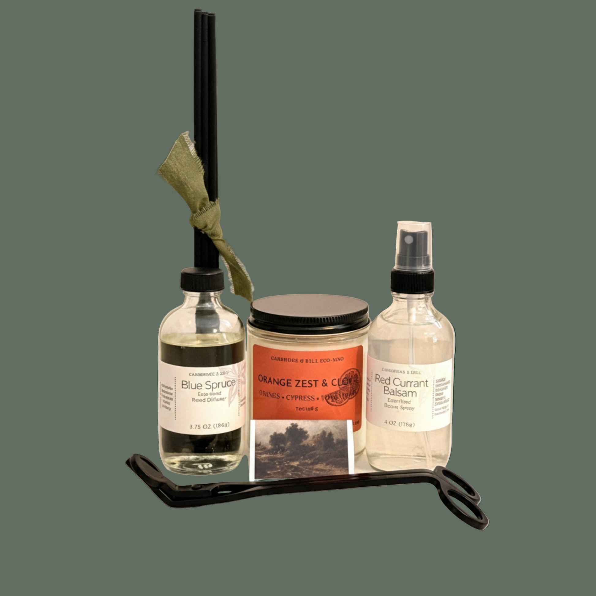 Inside you’ll find our Orange Zest & Clove 7 oz Candle, a radiant blend of citrus and spice; a Red Currant Room Spray for a burst of crisp, fruity brightness; and a Blue Spruce Reed Diffuser that evokes fresh evergreen air and twinkling lights. Complete the set with forest-inspired box matches and a sleek black matte wick trimmer—the perfect finishing touch for candle lovers.